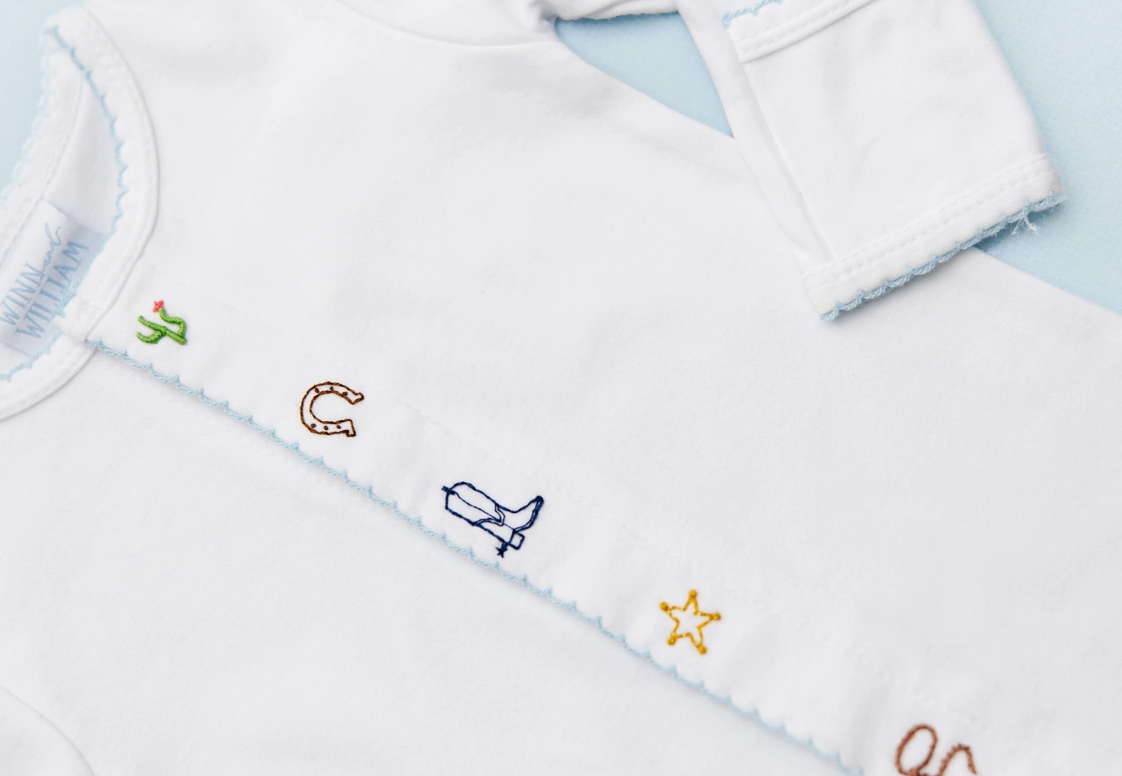 Soft 100% cotton sleeper with a baby blue picot trim