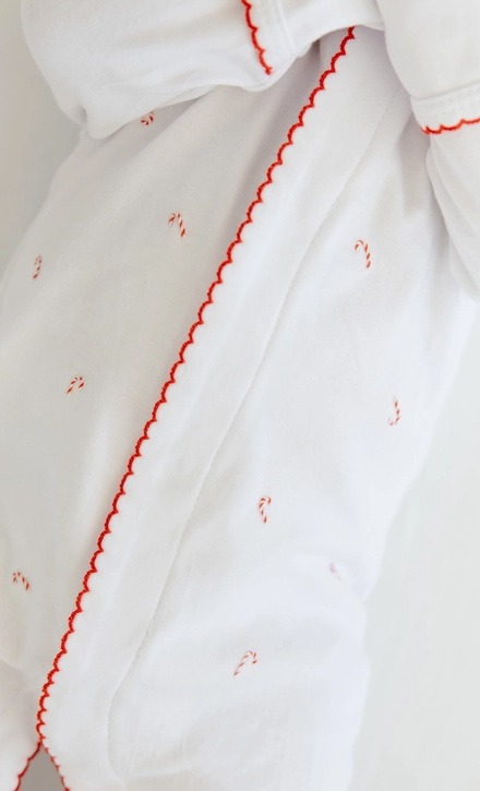 Soft 100% cotton sleeper with a red picot trim with hand-embroidered candy canes