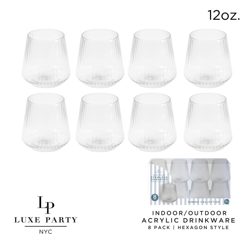 Round | Clear | 12 Oz | Stemless | Ribbed Product Details Part Number: LX-1106-CLEAR Size: 12 Oz Use: Dinner • Buffet Color: CLEAR Pattern: Round • Ribbed Material: Premium Plastic Care and Maintenance Care: Hand Wash • Microwavable • BPA Free