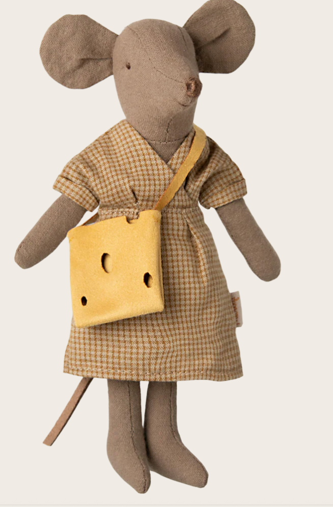 Mum mouse in light brown body fabric. She wears a dress and a bag with cheese holes. This mouse fits furniture and accessories in size mouse. Buy more clothes separately, clothes in size mum/dad fits this mouse.