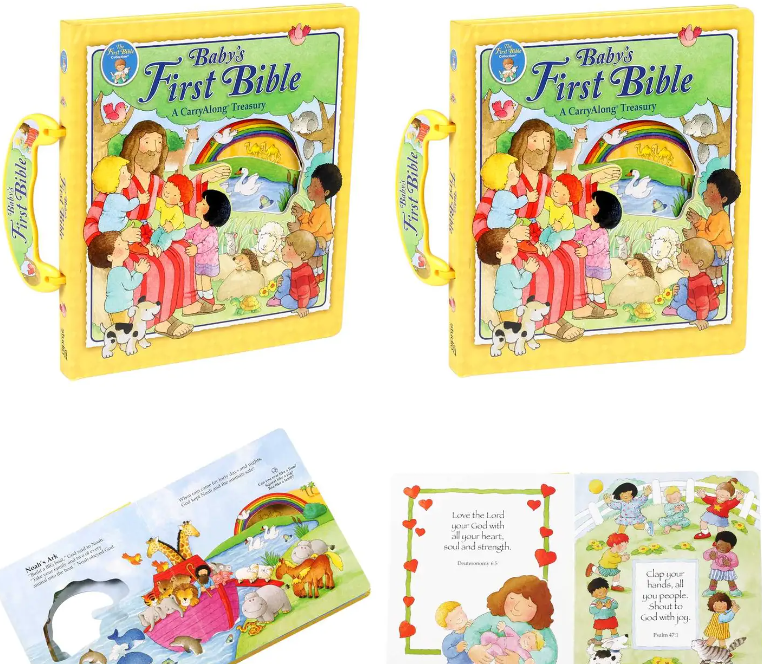 The best-selling Baby’s First Bible is now available in this 20th Anniversary edition! Featuring beloved Bible stories from both the Old and New Testaments, this popular CarryAlong with plastic handle is a perfectly portable first Bible. The best-selling Baby’s First Bible is the perfect introduction for young children to the Bible. Carefully selected stories, timeless verses, and delightful rhymes take young children on a journey from creation through the resurrection. Perfectly portable with a built-in plastic handle, this book can go anywhere. A simple activity on each spread, peek-through windows, and beautiful illustrations will make Baby’s First Bible a book to treasure!